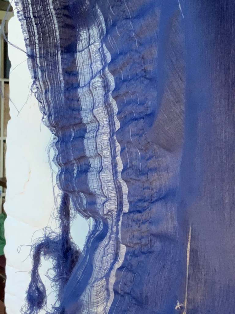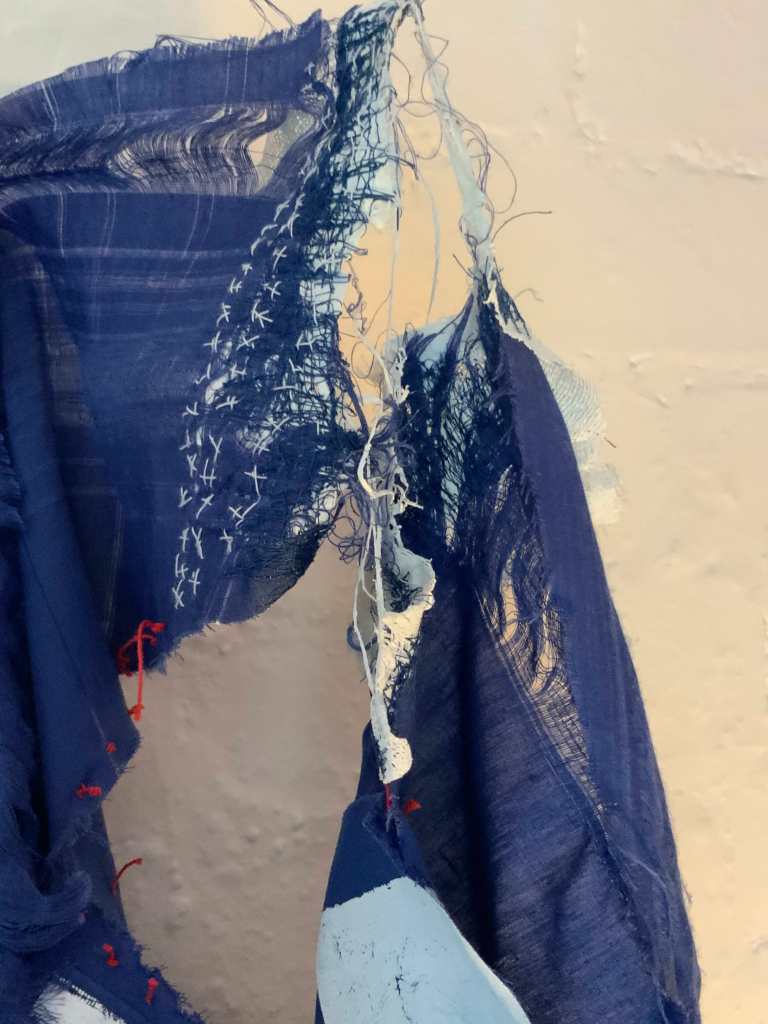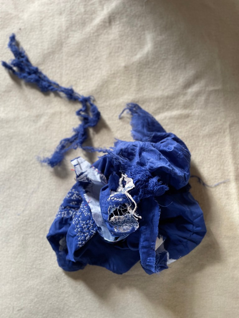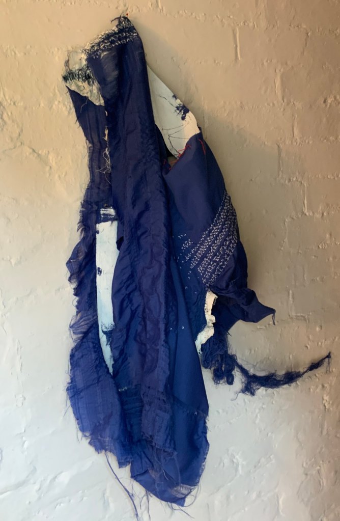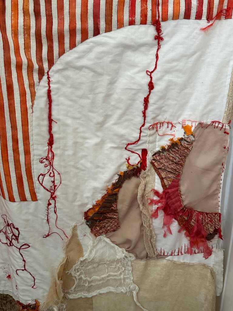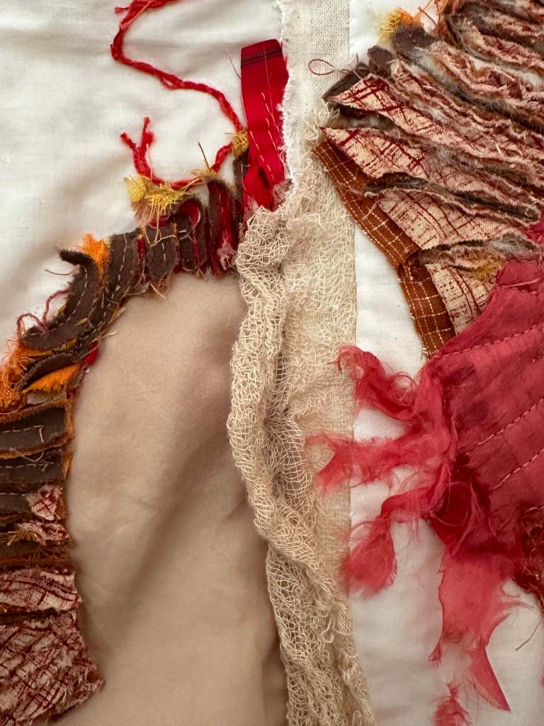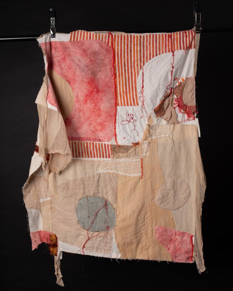 Dye print, faux chenille using repurposed textiles. Appliqué on calico.
